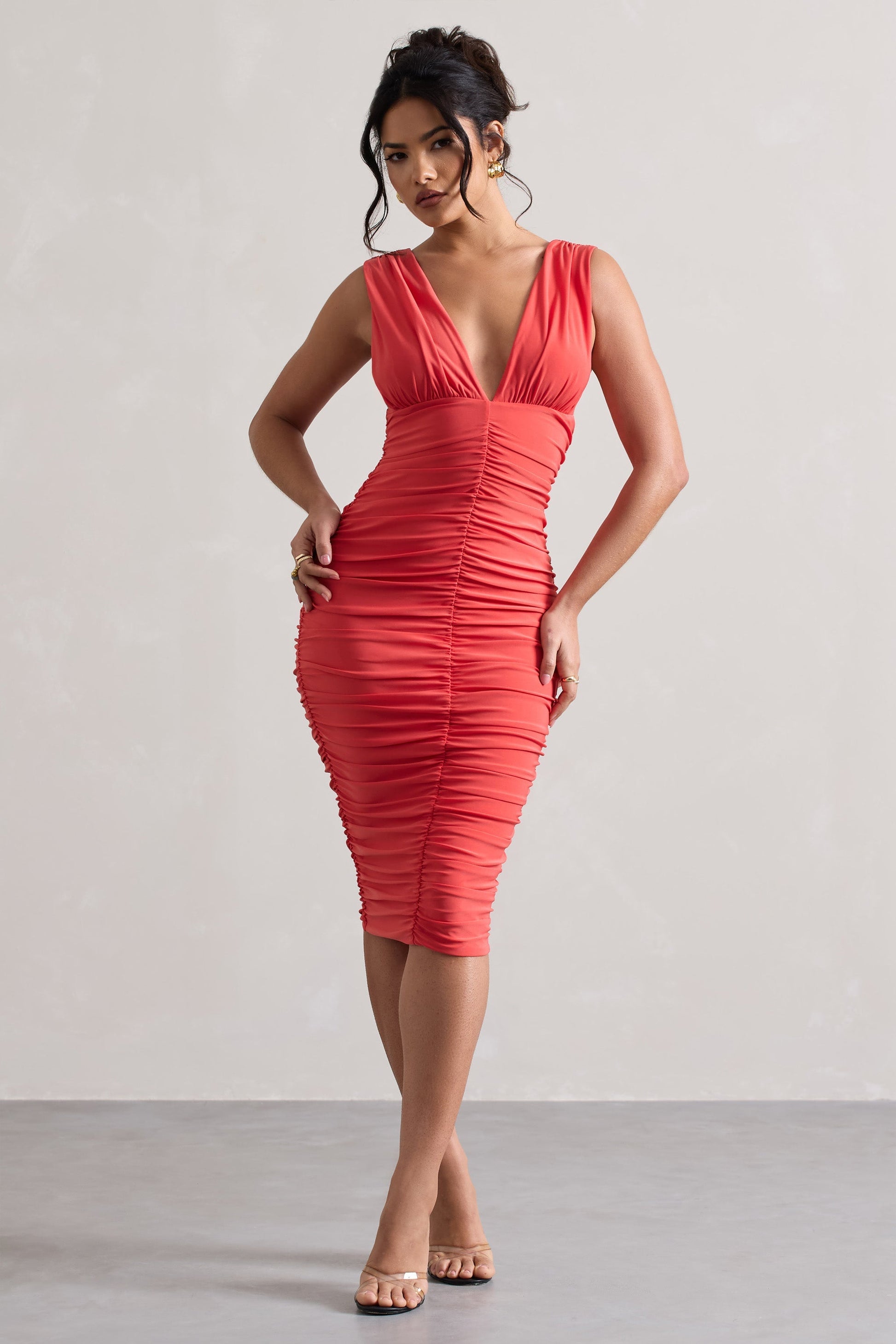 Attract | Coral Ruched Plunge-Neck Midi Dress