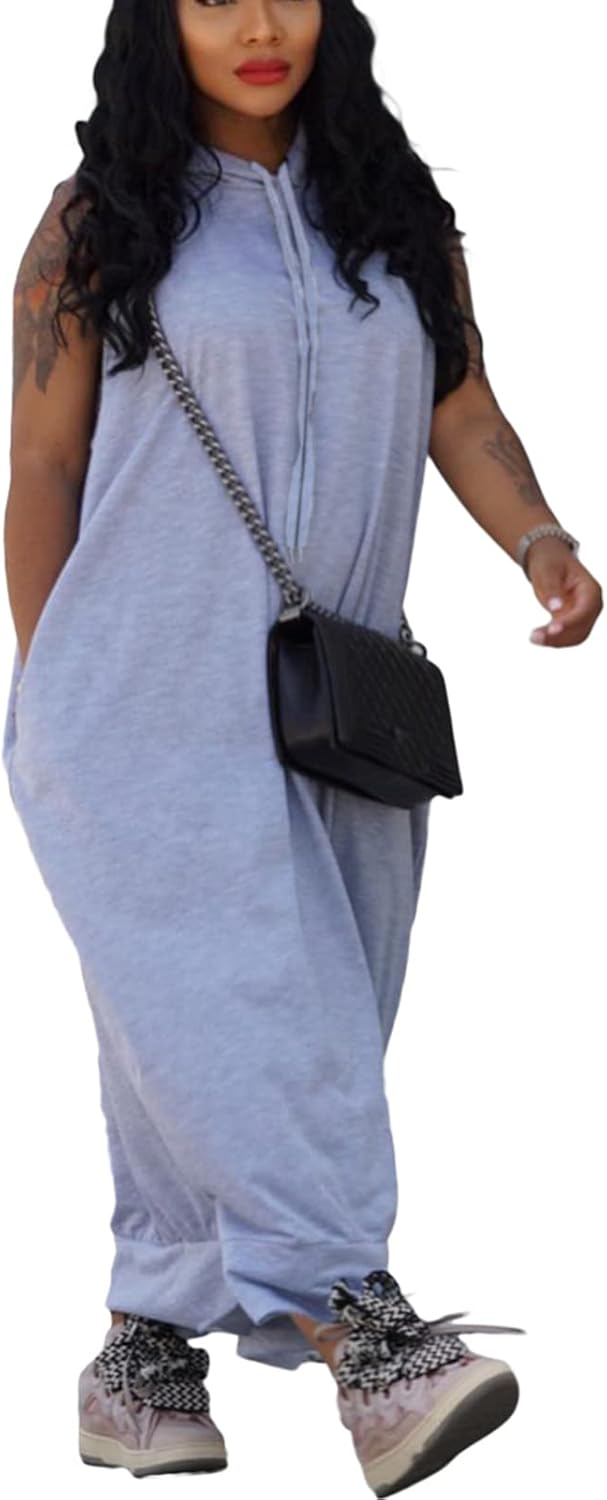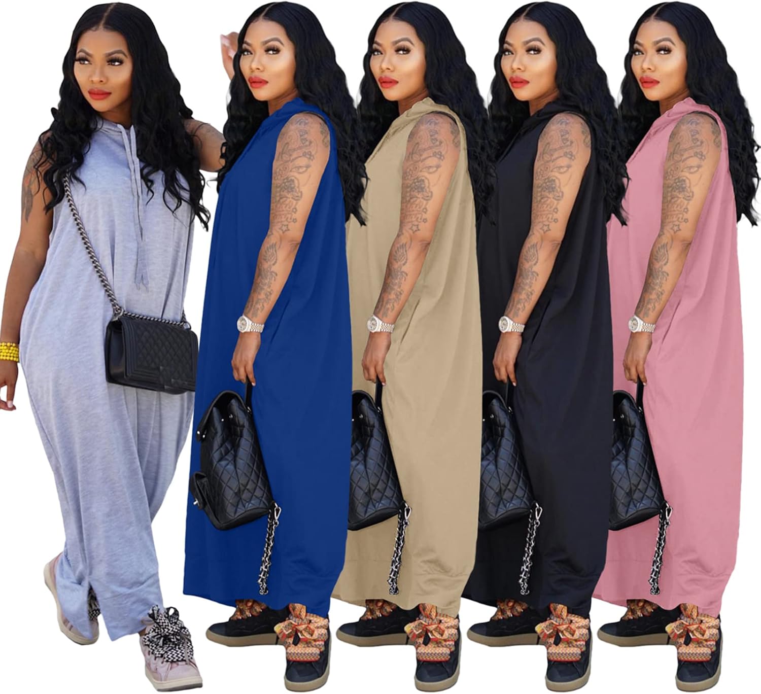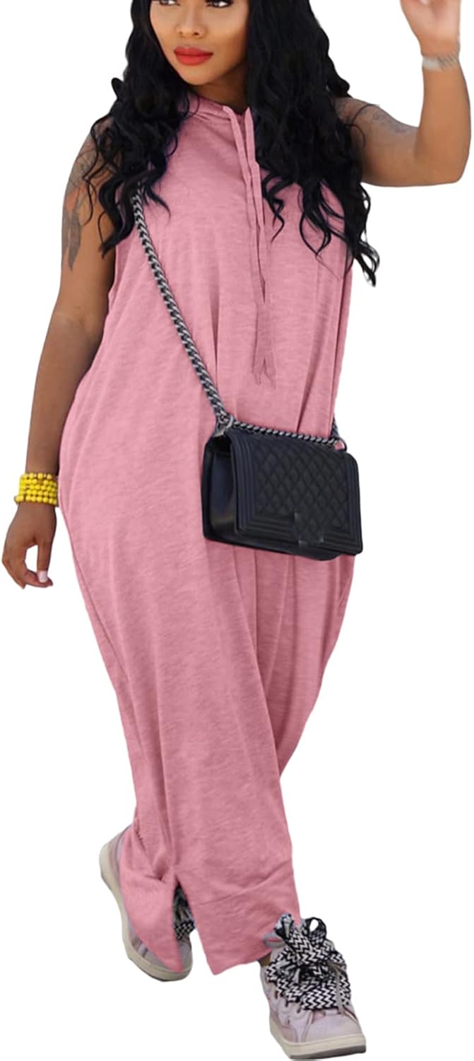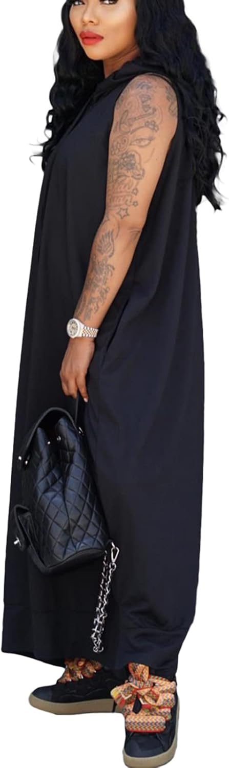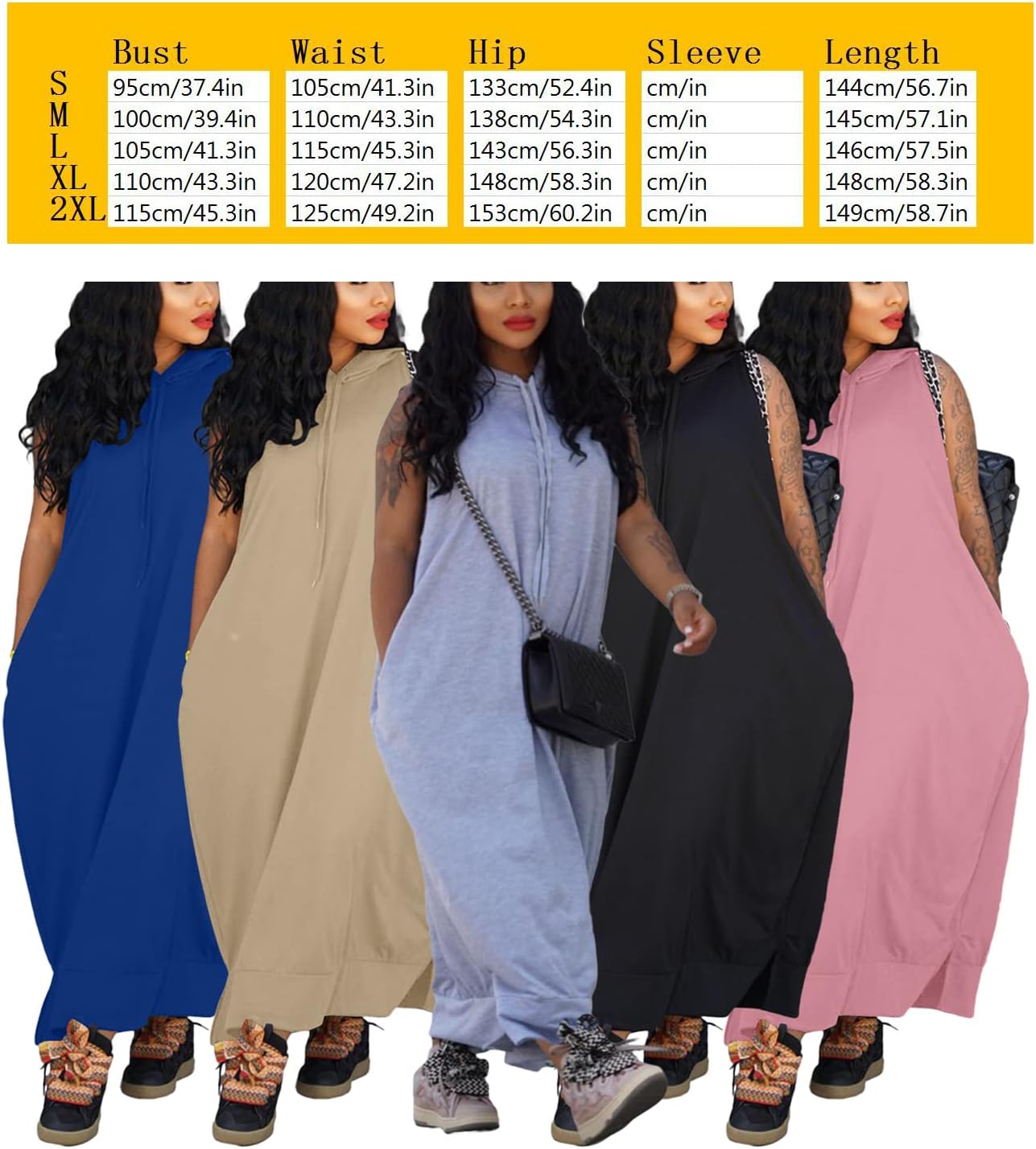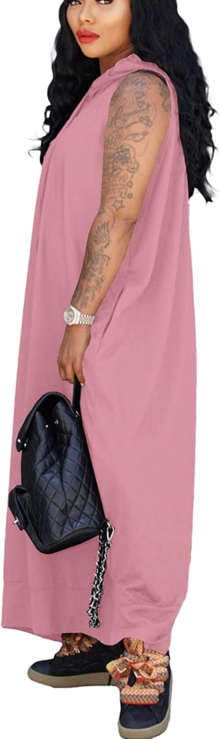 Bluewolfsea Vestido largo con capucha para mujer, casual, holgado, sin mangas, con bolsillos, abertura lateral, vestido largo
