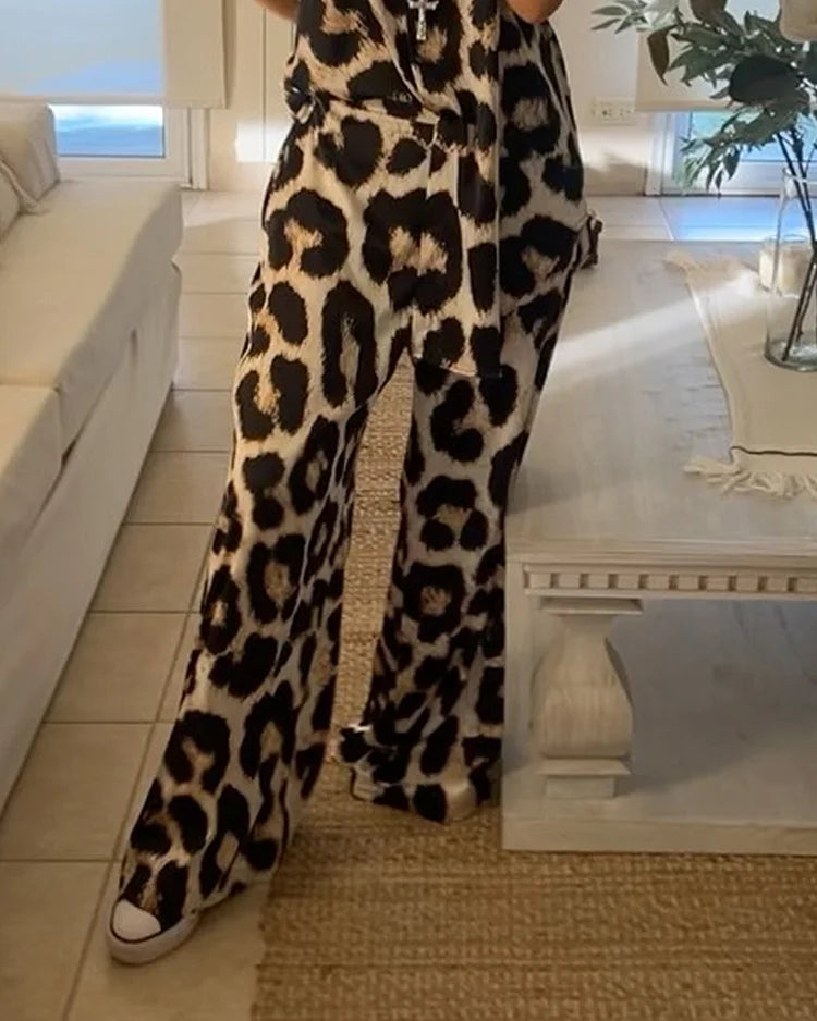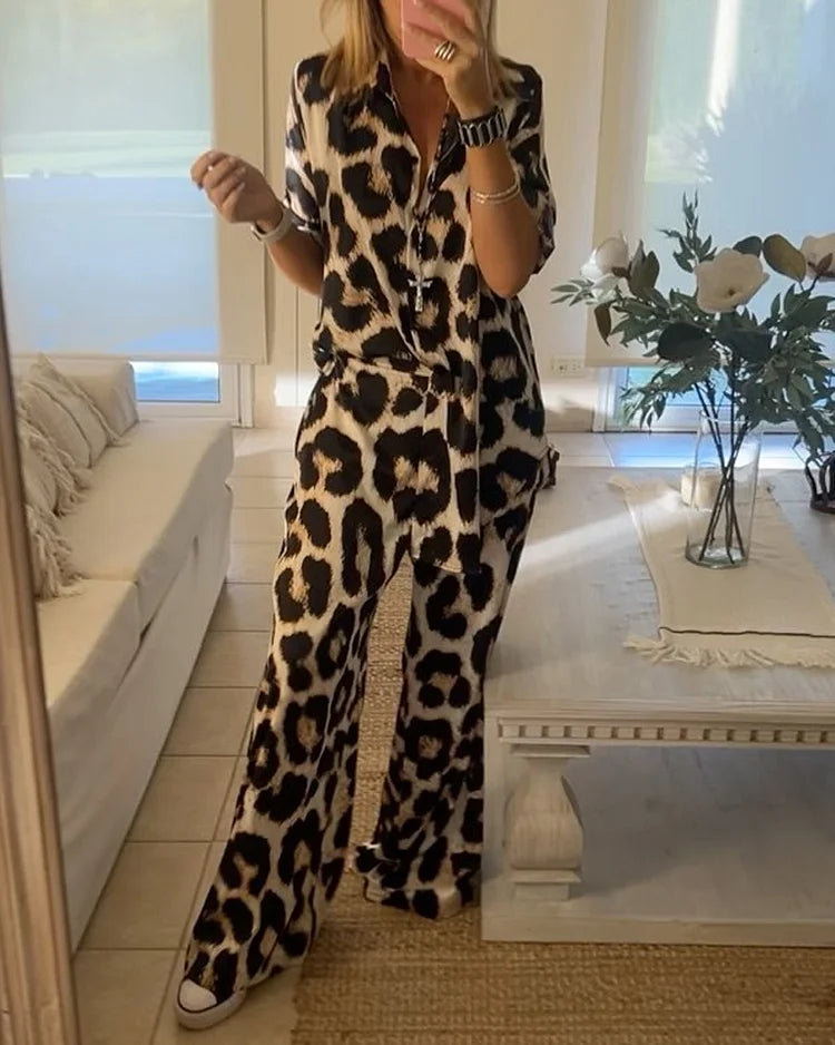 Conjunto Elena de Dos Piezas Suelto: Camisa Manga Corta y Pantalón Palazzo Estampado de Leopardo