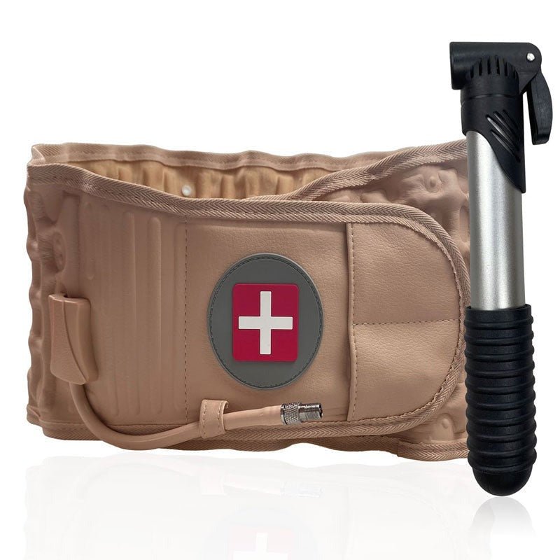 THIS BELT is used by doctors and back specialists during visits. When it is inflated, it increases in height by 4 inches (7.5 cm). The belt cradles the hip and the lower rib cage, it helps lift your upper body, unloading the weight of the lower back and allowing the muscles to relax.