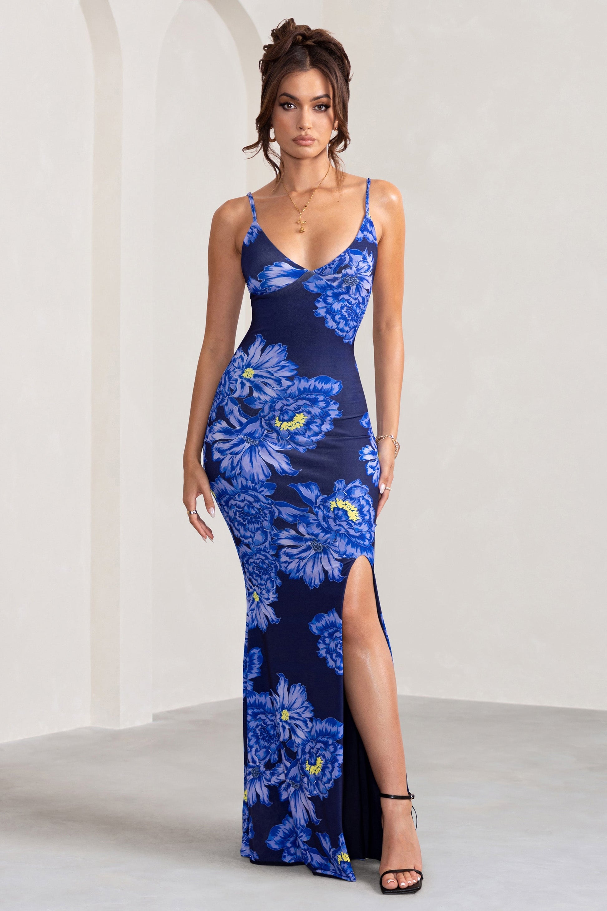 Farah | Blue Floral Print Plunge Neck Maxi Dress With Split Detail