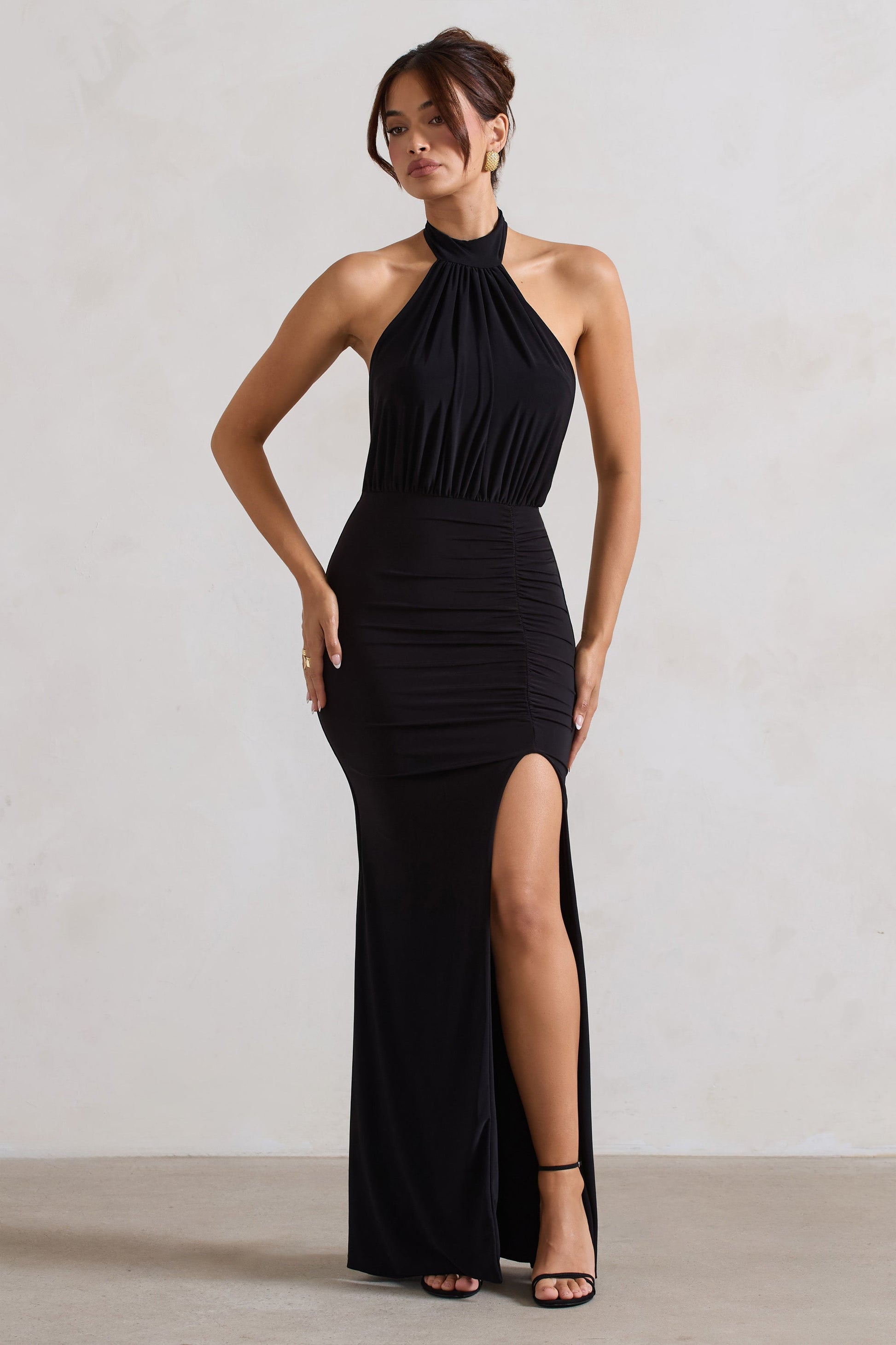 Forever Dreaming | Black Backless Halter Neck Ruched Split Maxi Dress
