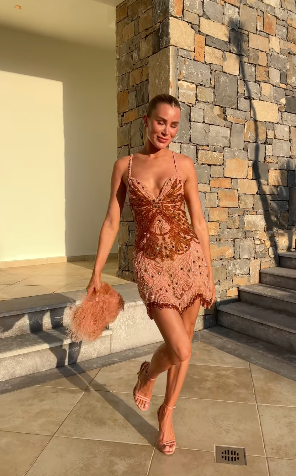 The hemline is trimmed with playful fringe and bead details, creating movement with every step. Finished with a hidden back zipper and a lightweight lining for a seamless fit, the Giselle Dress is perfect for glamorous evenings, destination weddings, or special celebrations.