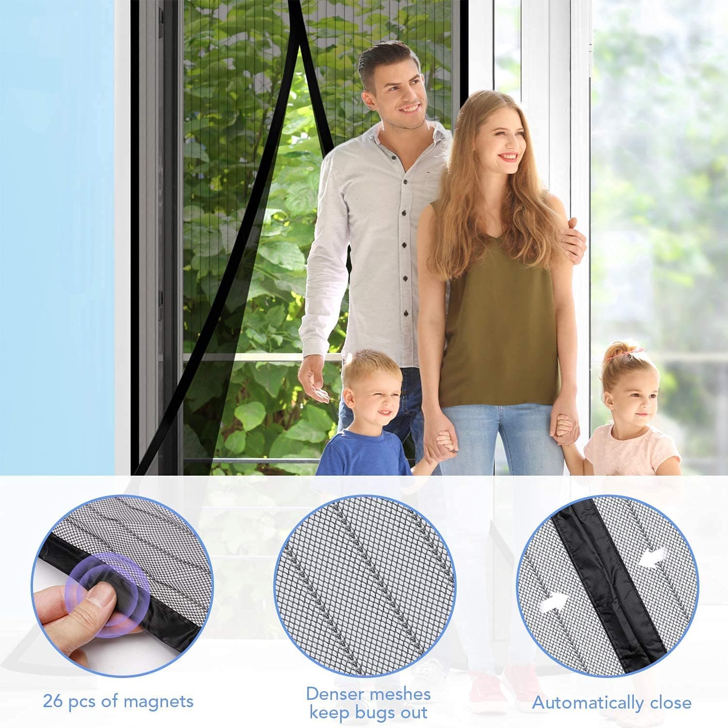 A great way to help block mosquitoes. The door mesh is a hands-free screen door that easily opens without hands and uses powerful magnets to instantly close itself to keep fresh air in and bugs out and is 30% stronger.