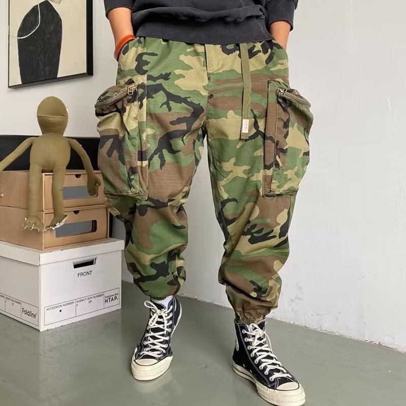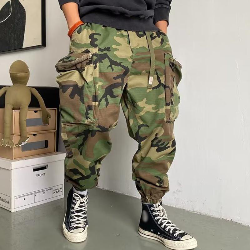 Drawing inspiration from military styles and infused with retro elements, the unique camo design sets these pants apart. The large pocket design not only enhances the fashion quotient but also offers practicality. The overall design exudes a carefree and casual style, allowing you to radiate personality and charm during urban explorations.