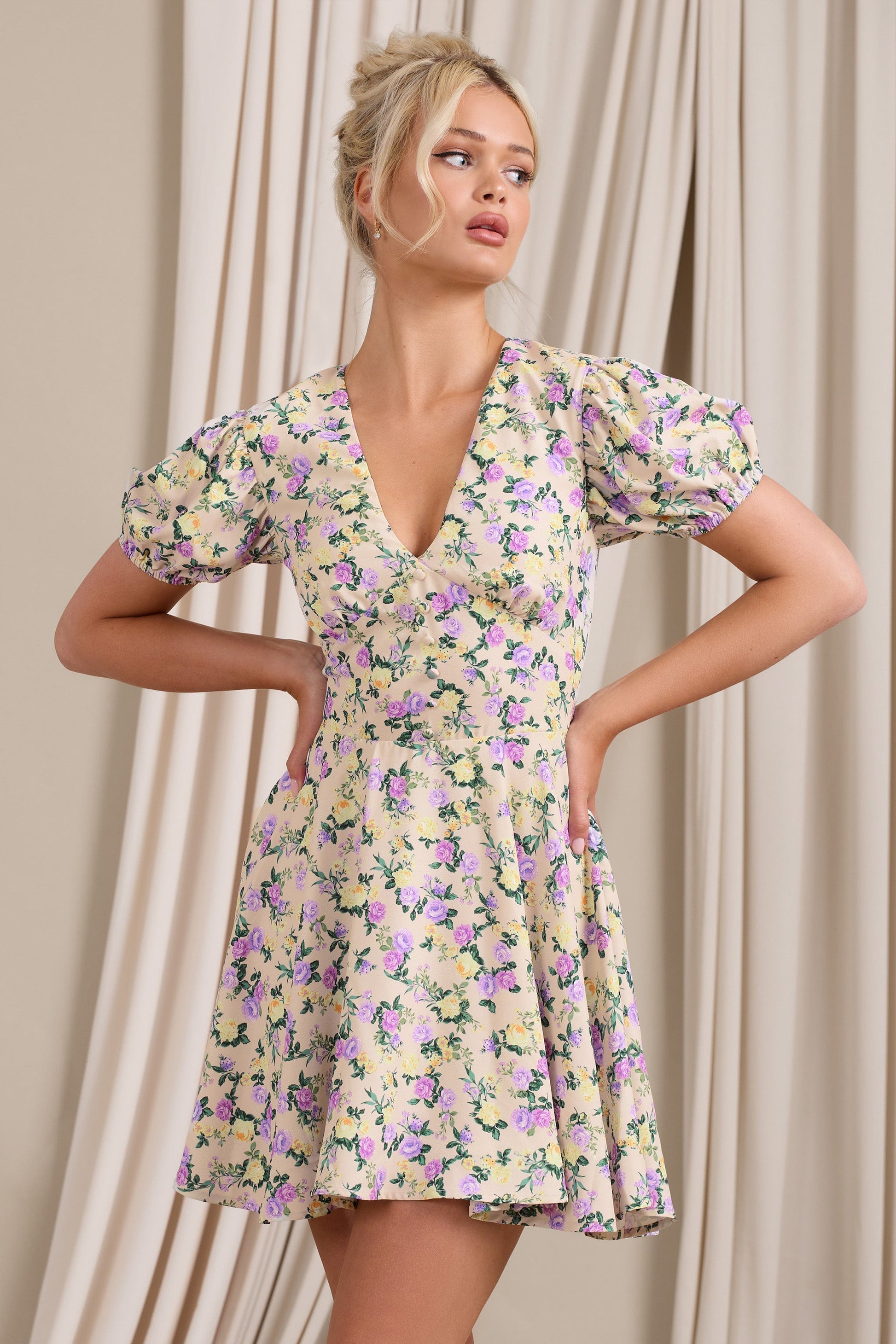 Si Si | Yellow Floral V-Neck Puff-Sleeved Buttoned Mini Dress