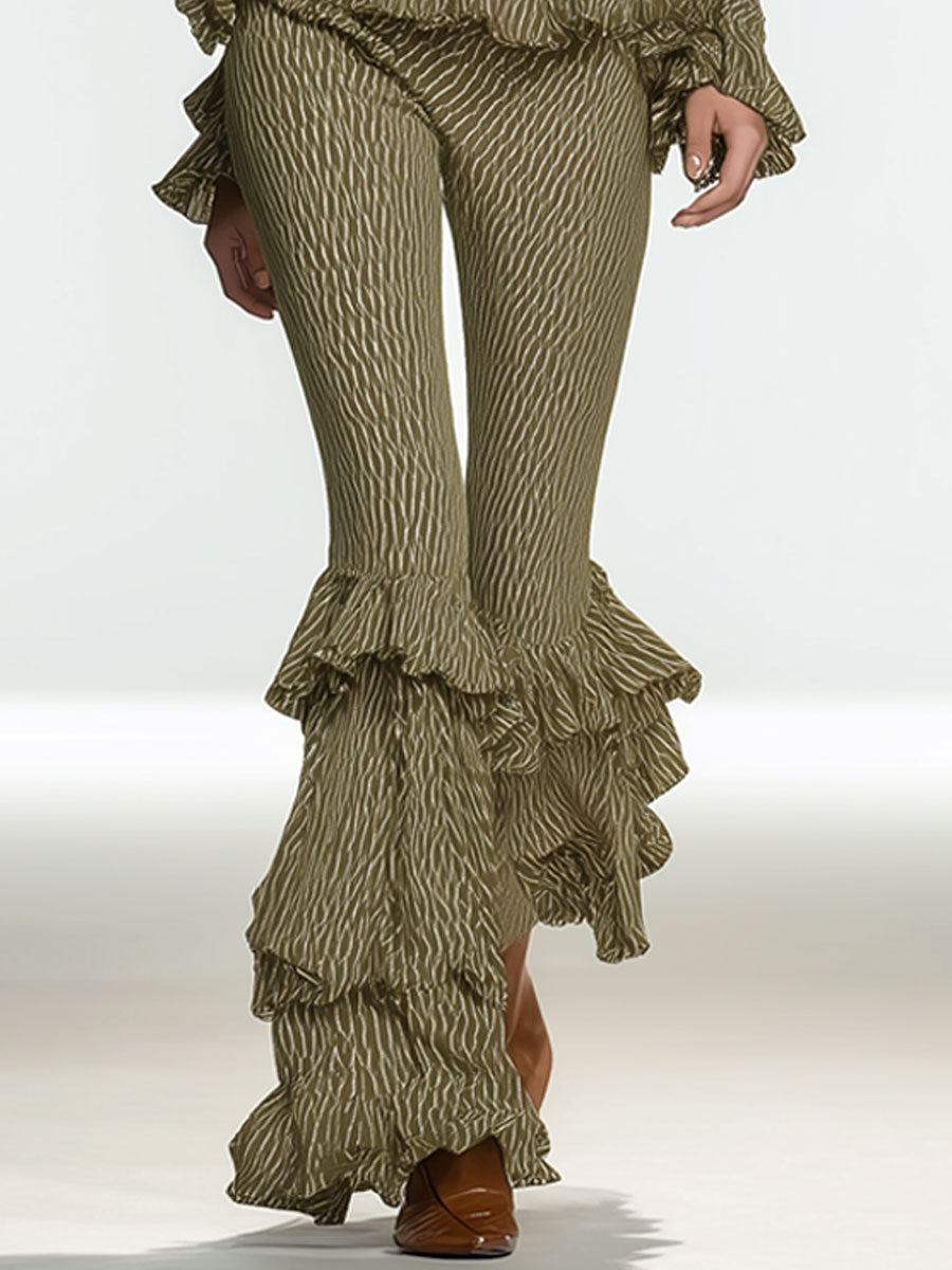 Step into refined elegance with the Verdeil Suit, a statement ensemble that merges vintage stripe charm with flowing chiffon allure. With its olive green and white diagonal stripes, ruffled long sleeves, and flared wide-leg pants, this suit balances soft fluidity and structured sophistication.