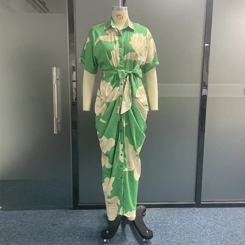 The dress has buttons down the front like a long t-shirt and ties at the waist. This gives a feminine and elegant touch to the dress, as well as adding a casual touch.